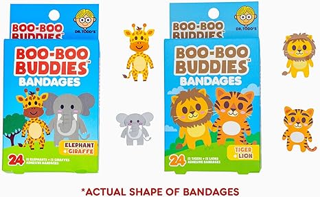 2-Pack Boo Boo Buddies™ Animal Safari Bandages – 48 Ct | Elephant + Giraffe Shapes & Lion + Tiger Shapes | Latex-Free, Waterproof Bandages for Kids | Fun Shapes for First Aid Kits & Sensitive Skin