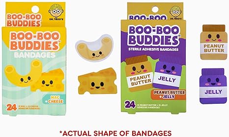 2-Pack Boo Boo Buddies™ Mac + Cheese and Peanut Butter + Jelly Bandages – 48Ct | Fun Food-Shaped Adhesive Bandages for Kids & Adults | Latex-Free, Waterproof, and Hypoallergenic First Aid Bandages for Sensi