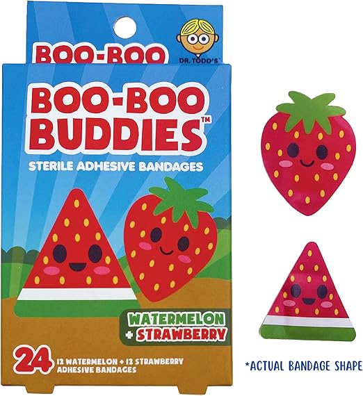 2-Pack Boo Boo Buddies Kids Bandages – Watermelon + Strawberry, Peanut Butter + Jelly Shapes | 24 Count Each | Waterproof, Latex-Free Adhesive Bandages for Sensitive Skin, First Aid Kit, Party Favors, Stock
