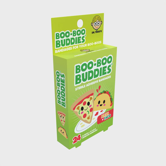 Spice up your first aid kit with Dr. Todd’s Boo-Boo Buddies® Pizza + Taco Bandages! These deliciously adorable die-cut bandages are shaped like smiling slices of pizza and happy tacos — perfect for hungry little imaginations.
